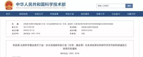 關於科研誠信問題,科技部曾多次發文。早在2020年,科技部、自然科學基金委下發通知,進一步壓實國家科技計劃任務承擔單位的主體責任,其中明確,嚴格把好學術關、誠信關,確保發表的論文嚴謹規範、數據真實;對嚴重違背科研誠信、科研倫理等要求的,要嚴肅查處。