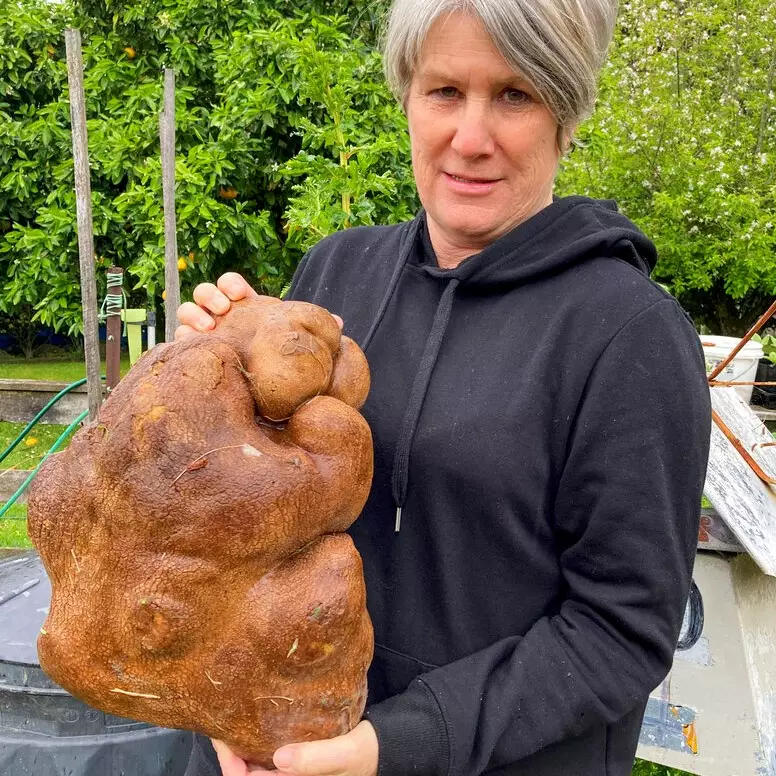 綜合外媒報導,來自紐西蘭北島漢密頓(Hamilton)的布朗斯(Colin Craig-Browns )和妻子唐娜(Donna Craig-Browns),今年8月在自家農場進行除草工作時,在土壤中發現一巨物,夫妻二人合力將之挖出來,驚覺是一顆超巨大薯仔。唐娜表示這顆薯仔的外觀很醜「如同異形」。