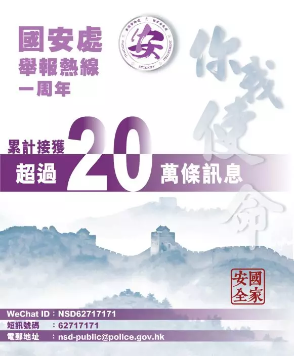 警務處國家安全處於去年11月5日開設「國安處舉報熱線」。過去1年,熱線累計接獲超過20萬條訊息。