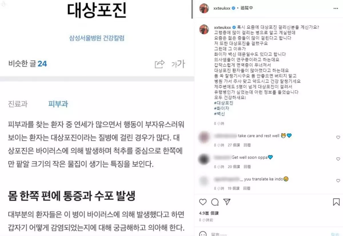 昨日利特透過個人IG分享了一張帶狀疱疹百科的截圖,並留言問:「最近有沒有人患上帶狀疱疹呢?」,表示這原本是老年人常見的病,但近年也越來越多年輕人患上。隨後他更透露自己也不幸確診患有帶狀疱疹,更疑似是因爲接種BioNTech疫苗後的副作用,不過具體原因醫生還在研究當中。