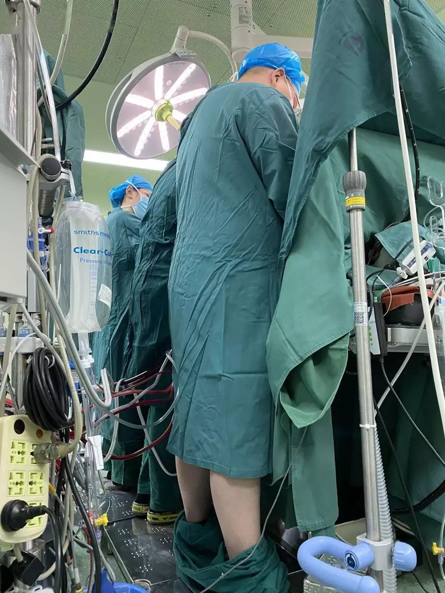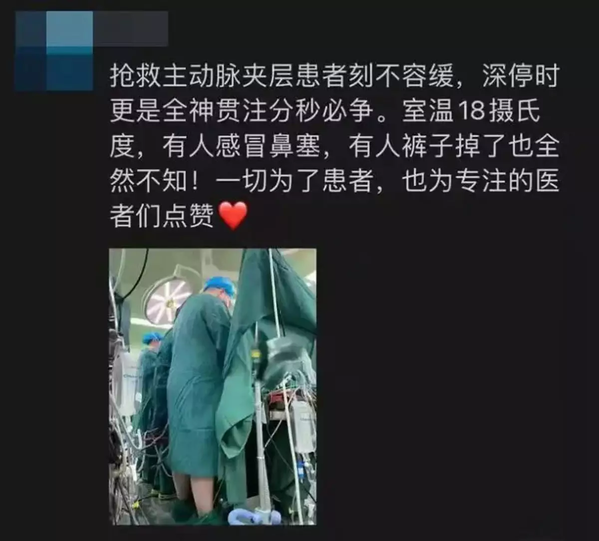 近日一張手術室照片在網上引起瘋傳,照片中一名醫生戴著手術帽和口罩,身穿全套防護衣物,但褲子卻完全滑落,晾在腳踝,而該醫生則專注於做手術,身旁醫護人員也似乎未察覺「異樣」。
