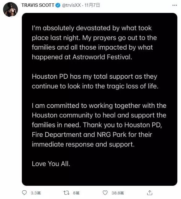 今日有報道指Travis願意負責8名死者的殮葬費,上周六他在網上留言致哀:「我為昨晚發生的事感到十分崩潰,我向那些在Astroworld Festival失去家人的家庭及受影響人士致哀。」他又承諾協助休斯敦社區治療傷痛,並全力支持警方的調查。