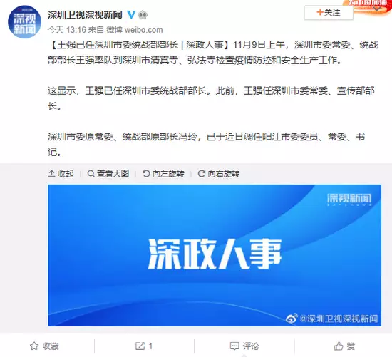 這顯示,王強已任深圳市委統戰部部長。此前,王強任深圳市委常委、宣傳部部長。