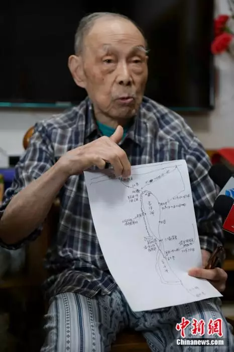 張崇岫手繪長津湖戰役地圖向記者介紹當時情況。張婭子 攝