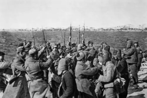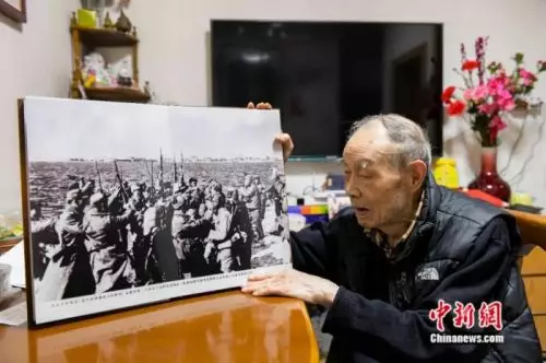 張崇岫介紹,這張圖片拍攝於1950年冬天,長津湖戰鬥勝利,志願軍第二十軍五十九師先頭部隊在咸興港與朝鮮人民軍戰士勝利會師。
