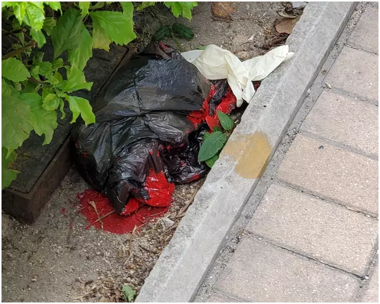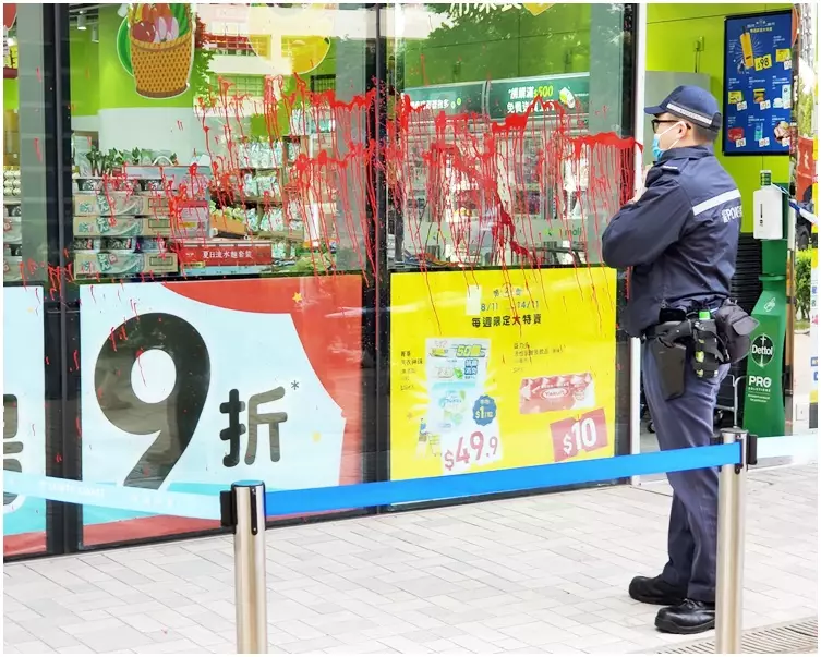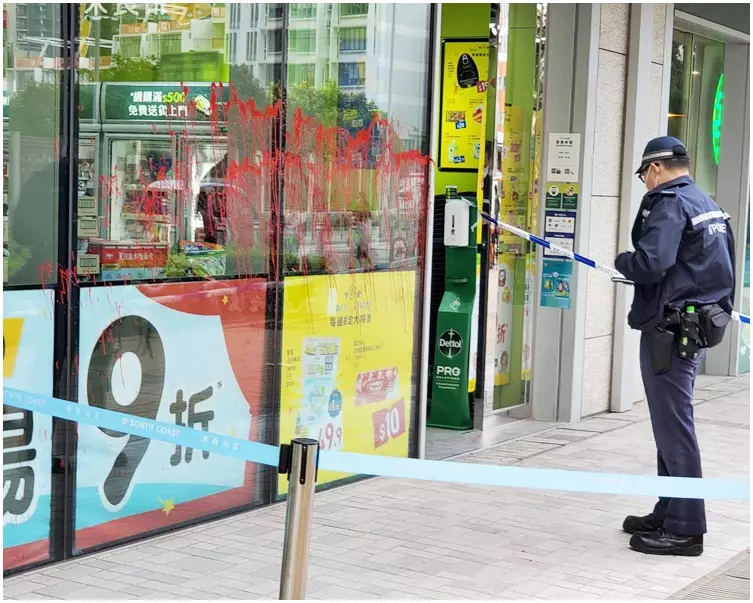 兩人得手後乘坐同一輛的士轉往至善街。警方及後接報指,位於至善街Savannah Place地鋪的HKTVmall超級市場遭淋紅油,警方相信兩名青年乘的士到場後再淋油,正追緝兩人的下落。