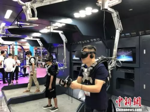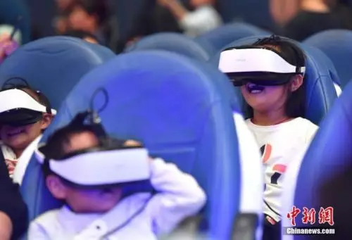 兒童戴著VR眼鏡體驗「太空飛行」。中新社記者 任東 攝