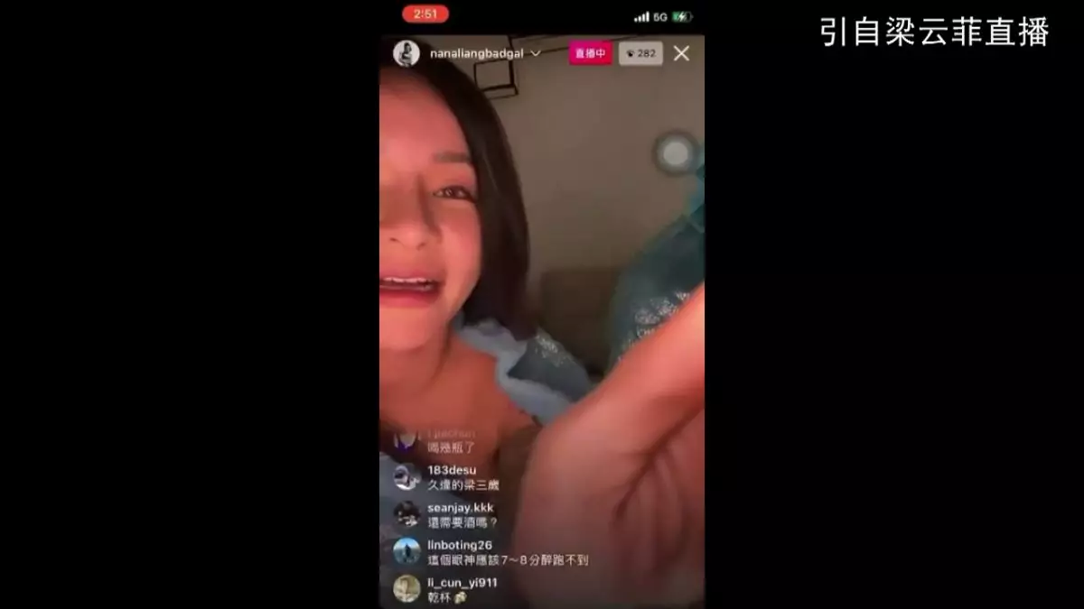 梁云菲走光後,有網友即時留言提醒,她才笑笑口把露肩裝往上拉好。及後梁云菲和閨密又拿起酒杯對飲,她似又喊又笑地說:「我平常不會這樣喝酒,今天真的心情不好。我真的不知道這些男人怎麼了,我就太單純了。」