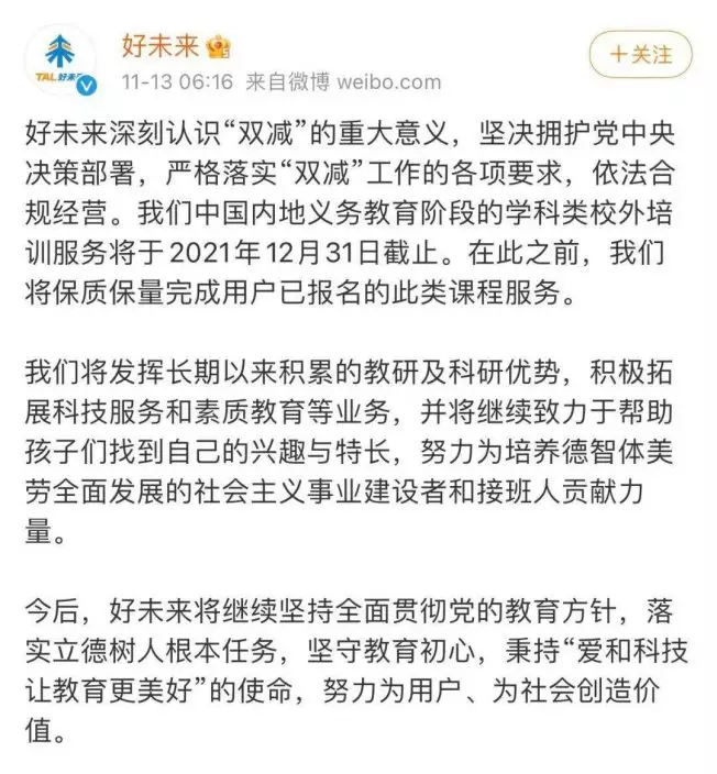 據好未來官方微博:好未來深刻認識「雙減」的重大意義,堅決擁護黨中央決策部署,嚴格落實「雙減」工作的各項要求,依法合規經營。中國內地義務教育階段的學科類校外培訓服務將於2021年12月31日截止。在此之前,將保質保量完成用戶已報名的此類課程服務。