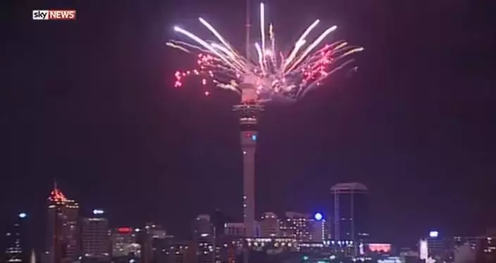 煙花在奧克蘭天空塔上方綻放,歷時約五分鐘。由於時差關係,奧克蘭在本港時間晚上七時迎接新一年,澳洲悉尼新一年會在本港時間晚上九時。