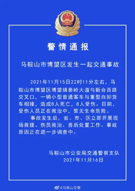 11月15日22時11分左右,馬鞍山市博望區博望鎮秦嶺大道與新合西路交叉口,一輛小型普通客車與重型自卸貨車相撞,造成8人死亡,8人受傷。目前,受傷人員正在救治中,暫無生命危險。