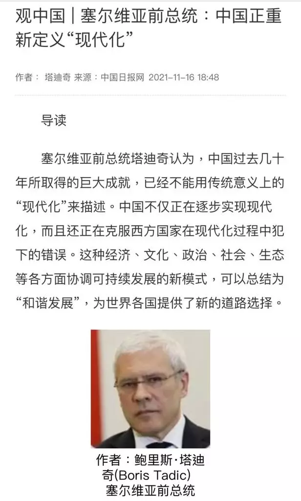 前塞爾維亞總統塔迪奇(Boris Tadic) 在中國日報發表文章指出,中國過去幾十年所取得的巨大成就,已經不能用傳統意義上的「現代化」來描述。中國不僅正在逐步實現現代化,而且還正在克服西方國家在現代化過程中犯下的錯誤。這種經濟、文化、政治、社會、生態等各方面協調可持續發展的新模式,可以總結為「和諧發展」,為世界各國提供了新的道路選擇。