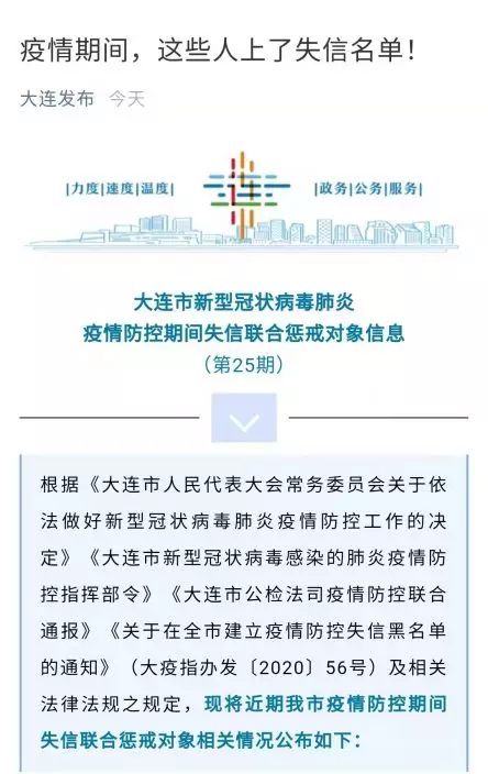 大連市新型冠狀病毒肺炎疫情防控期間失信聯合懲戒對象信息(第25期)公佈。