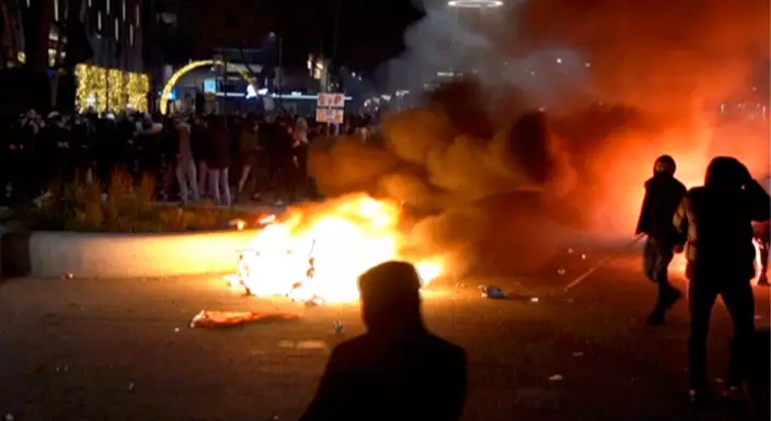 19日,荷蘭鹿特丹市中心爆發騷亂,警方名槍警告,傷者人數不詳。AP圖片