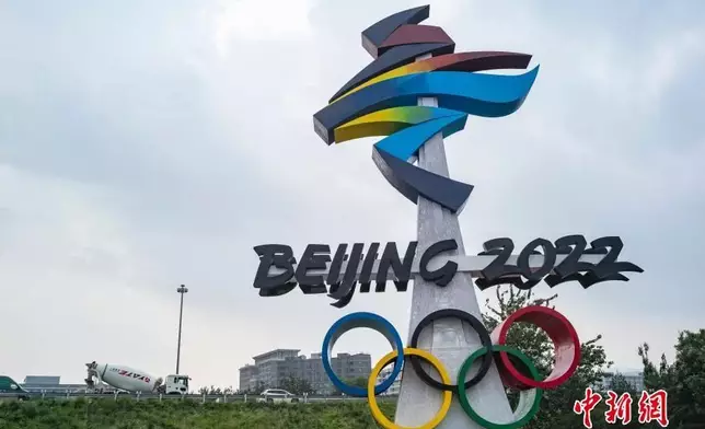 北京市西五環晉元橋東北角匝道處矗立著北京2022年冬奧會會徽雕塑 中新社記者 侯宇 攝