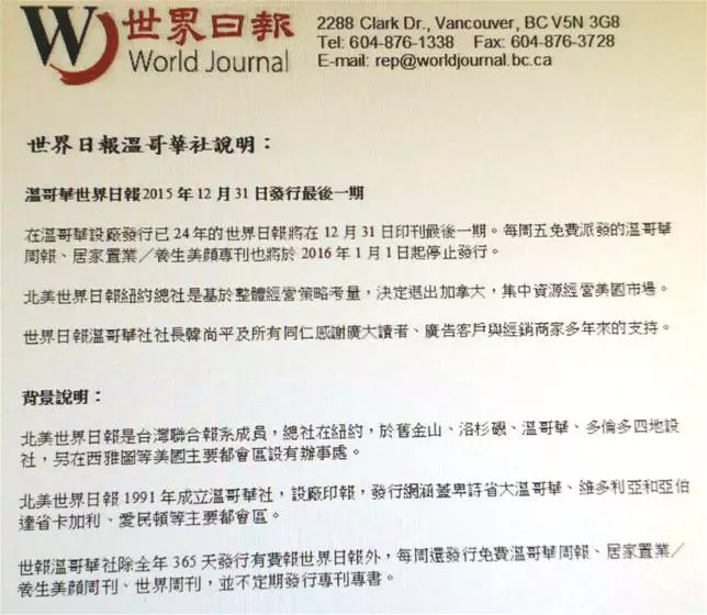 報業寒冬,弱報難捱,最新一章是台灣的《世界日報》宣布,今年12月31日印刷最後一期後,在加拿大全面停刊。《世界日報》撤出加拿大後,集中資源在美國經營。