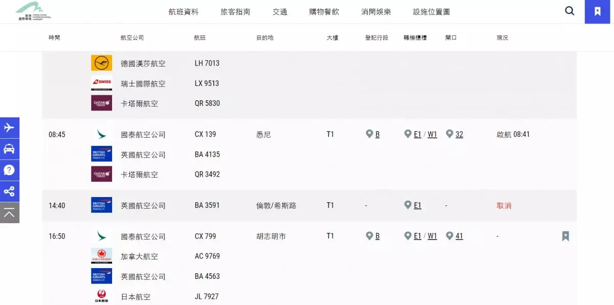 翻查資料,英航香港飛倫敦希斯路的BA 028航班於今日凌晨啟航後,原定今晚11時45分起飛的同編號航班已取消;明日(29日)及後日(30日)的BA 028航班也告取消;後日下午啟航的BA 3591亦取消。抵港航班方面,今日至後日有5班由倫敦希斯路飛香港的英航航班取消,包括今午12時40分及2時20分抵港的BA 3590及BA 027航班。