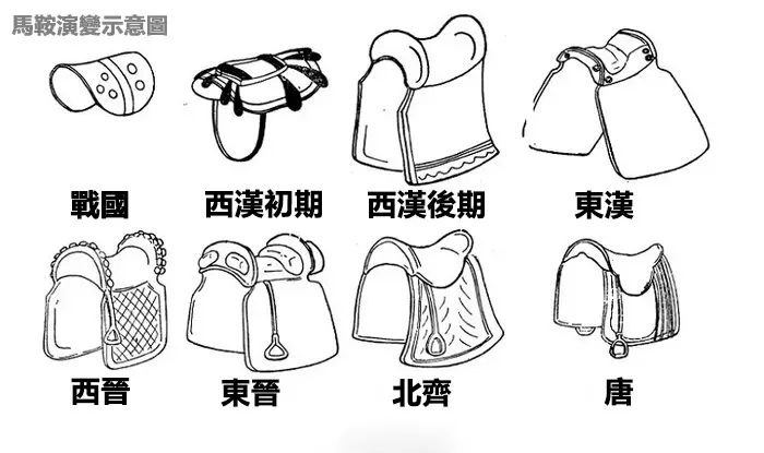 從出土的文物可證實,在西晉時期,馬鐙位於馬鞍左前側,只有一邊;而鐙革,只有人腿部的一半長,雙馬鐙要到東晉時才出現。我們亦透過北魏時期出土的陶馬俑,見到馬鐙位於馬的腹部,了解到在公元400多年的北魏時期,拓跋鮮卑人使用成熟的鐵馬鐙。