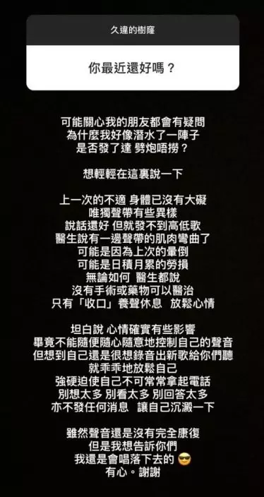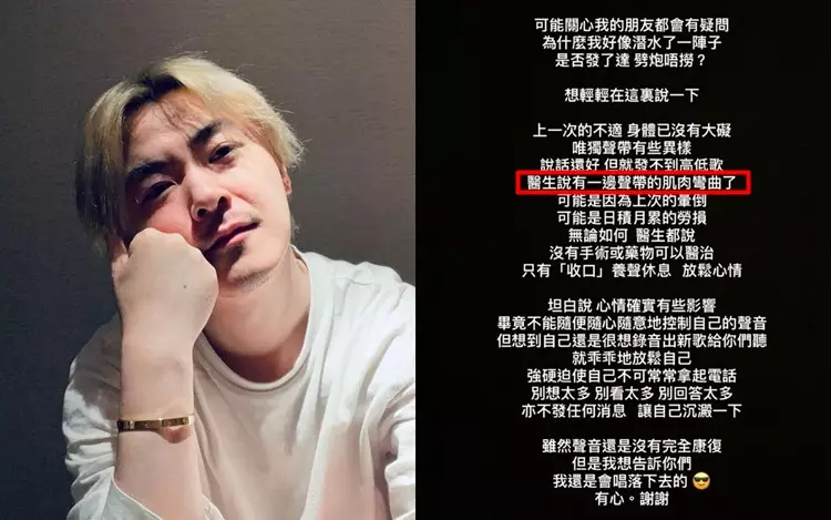 英皇歌手洪卓立(Ken)今年5月於順德拍劇中暑暈倒墮地,昏迷全身抽搐兼口吐白泡一度命危,其後返港治療休養。洪卓立鮮有露面,只間中更新社交網,日前他在IG Story透露最近身體又出現毛病,他寫道:「可能關心我的朋友都會有疑問,為甚麼我好像潛水一陣子,是否劈炮唔撈......上次的不適,身體已沒有大礙,唯獨聲帶有異樣,說話還好,但就發不到高低歌(音),醫生說有一邊聲帶的肌肉彎曲了,可能是因為上次的暈倒,可能是日積月累的勞損,醫生都說,沒有手術或藥物可以醫治,只有收口養聲休息,放鬆心情。」