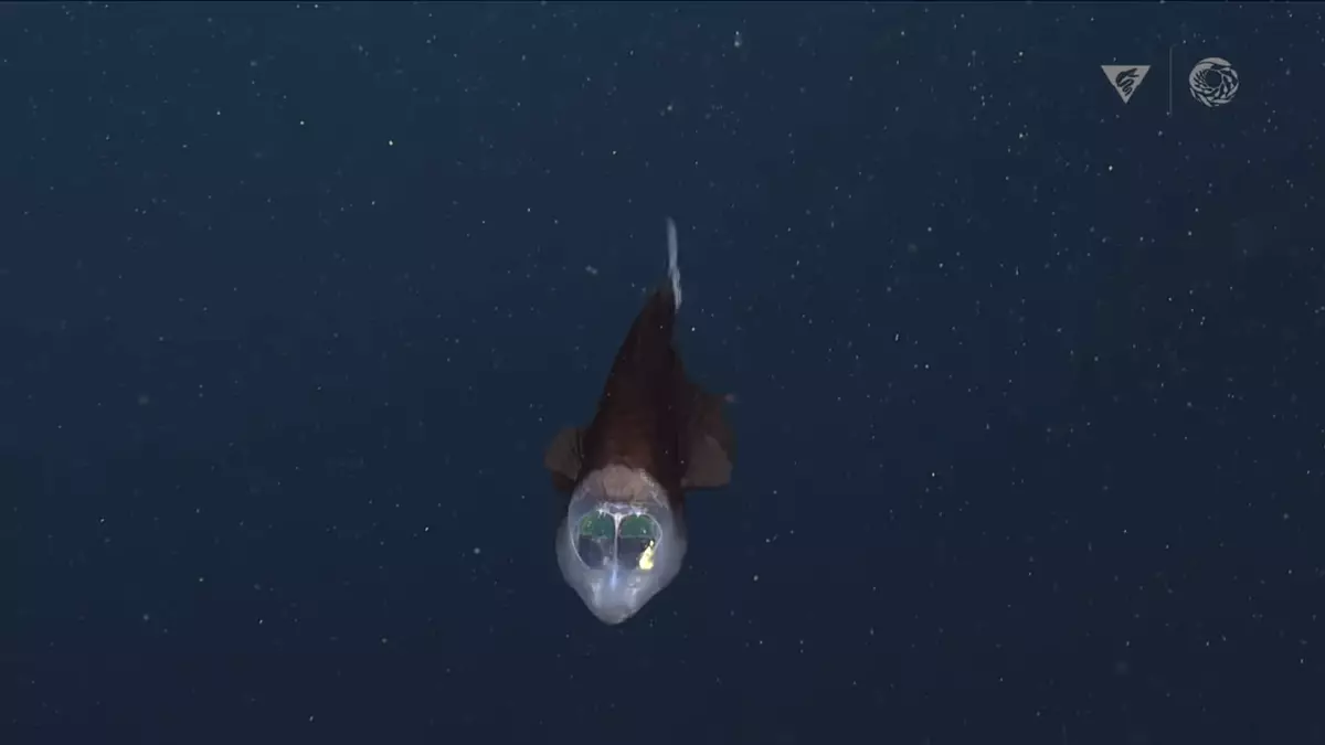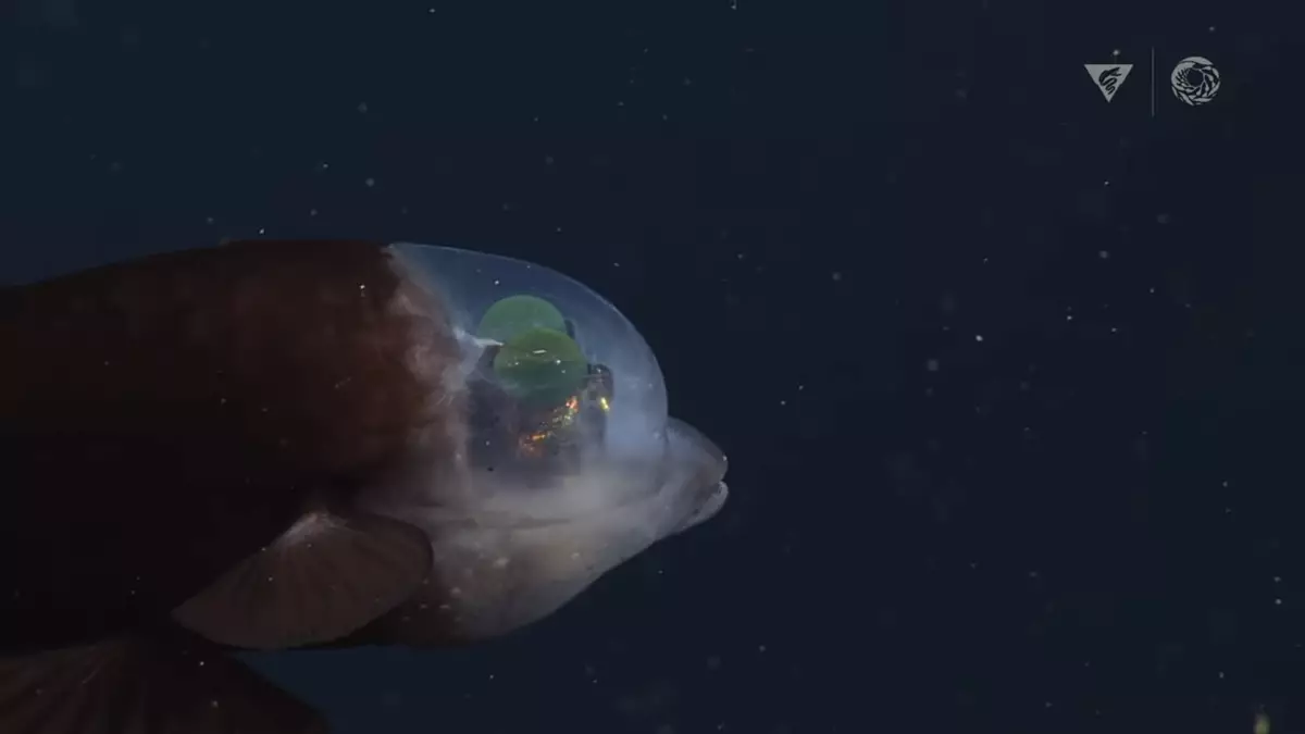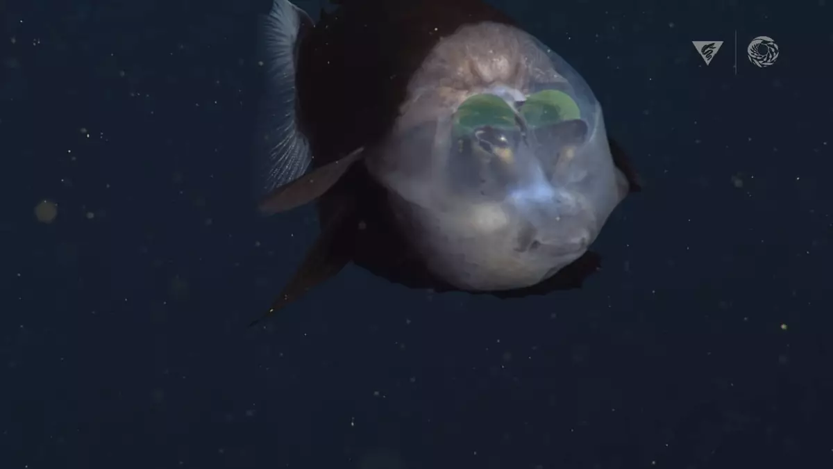 深海中暗藏著許多人類不甚了解的神秘海洋生物。最近,美國科學家在加州蒙特利灣進行深海觀測,拍攝到一條外形奇特的魚類,牠的整個頭部都是透明的,可見到內部構造,還長著兩顆綠色的眼珠,而專家指出在他們5600多次的任務中,只遇過這種魚9次。