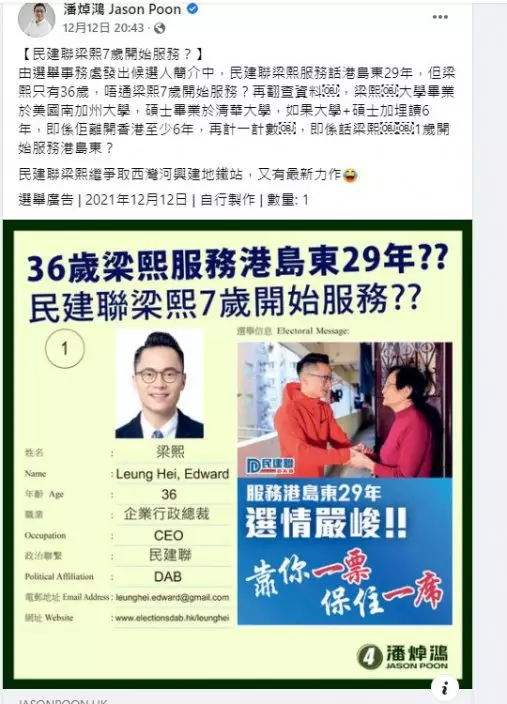 翻查資料,潘焯鴻曾在社交媒體發文,質疑「民建聯梁熙7歲開始服務?」並指根據選舉事務處發出候選人簡介,梁熙指「服務港島東29年」,但他只有36歲,並上傳相關選舉單張圖片。