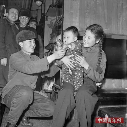 在遼陽站,列車員李玉春抱著小乘客。