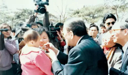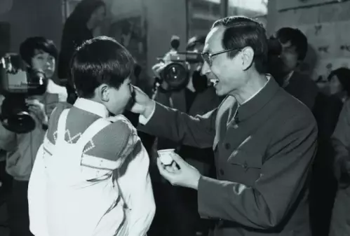 1986年4月25日是全國第一個兒童預防接種日,衛生部副部長陳敏章到北京市第五幼兒園給孩子們喂服糖丸。(圖片來源:人民畫報)