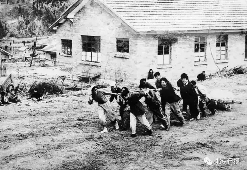 1959年,顧方舟(前排右一)在昆明與職工創建生物醫學研究所,正在建設工地平整地基。