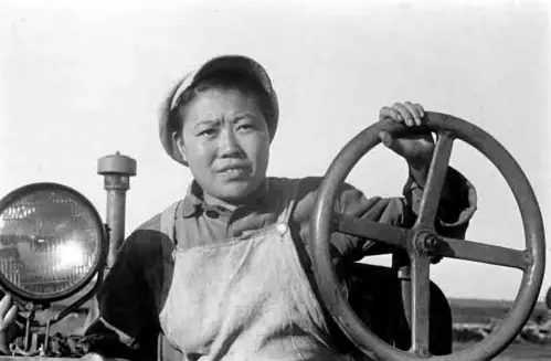 這是在黑龍江省德都縣萌芽鄉鄉師學校學習的女拖拉機手梁軍坐在蘇聯萬能拖拉機上的留影。