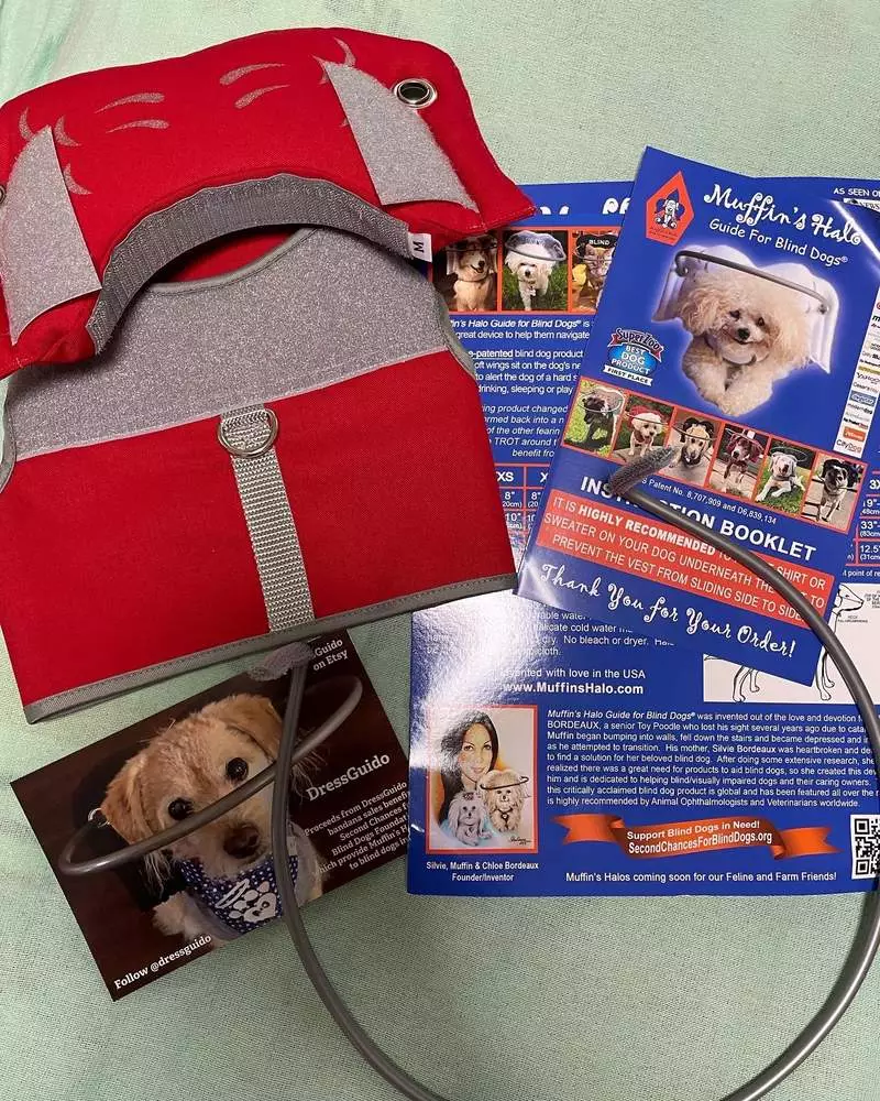 這個貼心設計的「導盲圈」或者叫做「防撞圈」,是一種固定在狗狗的衣服上,繞過頭部一圈的環狀工具。安裝這種工具以後,就能發揮有如人類使用導盲杖一般的作用,讓狗狗藉此理解周遭的環境,進而改善因為失明而對走路產生的恐懼。