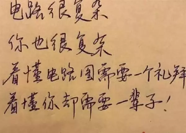 另一封相信是出自物理系高材生之手的情書以電路圖為引子,電路很複雜、你也很複雜。看懂電路圖需要一個禮拜,看懂你卻需要一輩子。網友們紛紛留言:「哇!已經講到一輩子了」、「學霸追求異性應該很快就能過關了吧」、「學霸的情書很專業又浪漫,有種很可靠的感覺哈哈」。