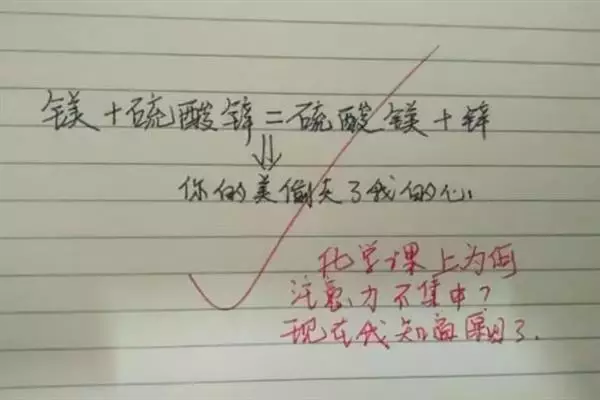 而化學系學霸的情書當然離不開化學元素,這位化學系男生寫到,鎂+硫酸鋅=硫酸鎂+鋅。你的美偷走了我的心。連老師都笑稱:終於知道化學課注意力不集中的原因了!