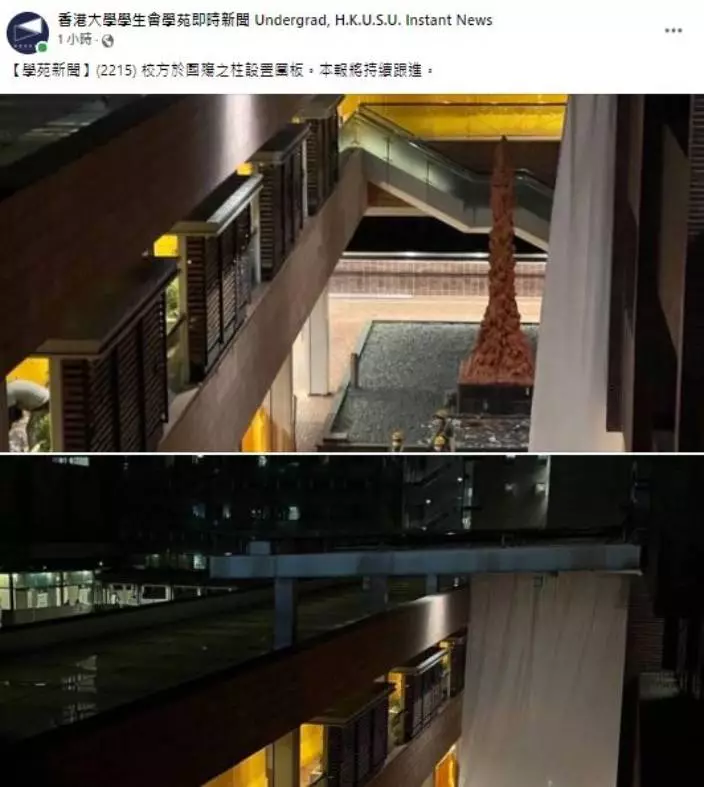 「國殤之柱」今晚(12月22日)突然被圍板圍封。「香港大學學生會學苑即時新聞」在社交平台上載相片,稱校方於「國殤之柱」設置圍板。從相片中可見,「國殤之柱」被樓高逾兩層的白布遮擋,而行人天橋可望到「國殤之柱」的位置亦被黃色圍板遮擋。