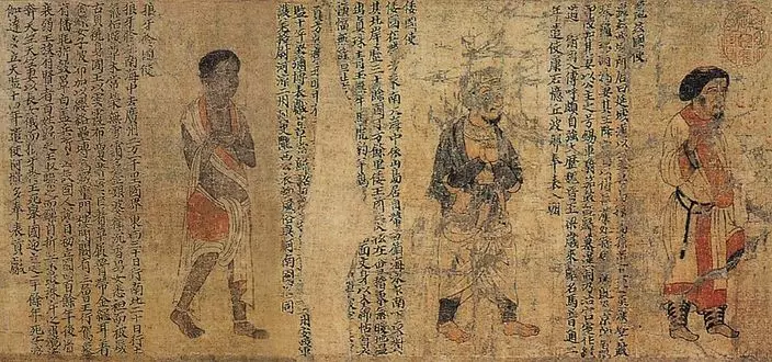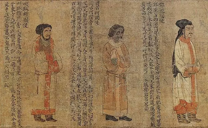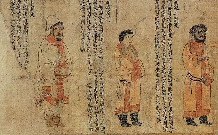 在古代中國,「職貢圖」用來記載少數民族進貢時,各進貢使者的特點。而在南北朝時期的南朝梁元帝蕭繹繪製的《職貢圖》,為傳世最早,原作創於526年-539年間,現存為宋人摹本的殘卷。內裡除了描繪了西域使者,還有南亞、朝鮮及日本使者,從《職貢圖》可以看到古時外國人的樣貌衣著等等。