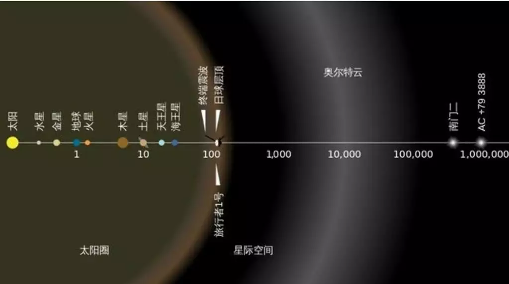 光從太陽到達地球,也就是穿越一個天文單位的距離,大約需要8分多鐘。以光速飛行,穿越150個天文單位大約需要21個小時。這段距離說起來並不短,只是旅行者1號探測器用40多年走過的距離還不到太陽系半徑的千分之二。