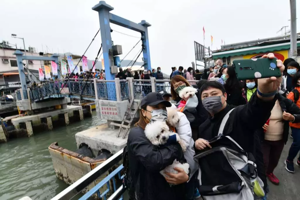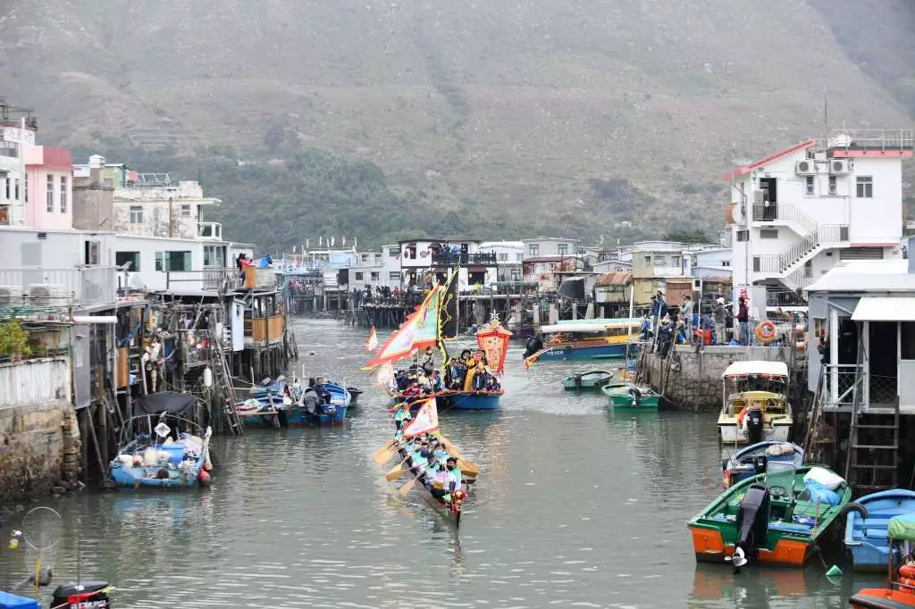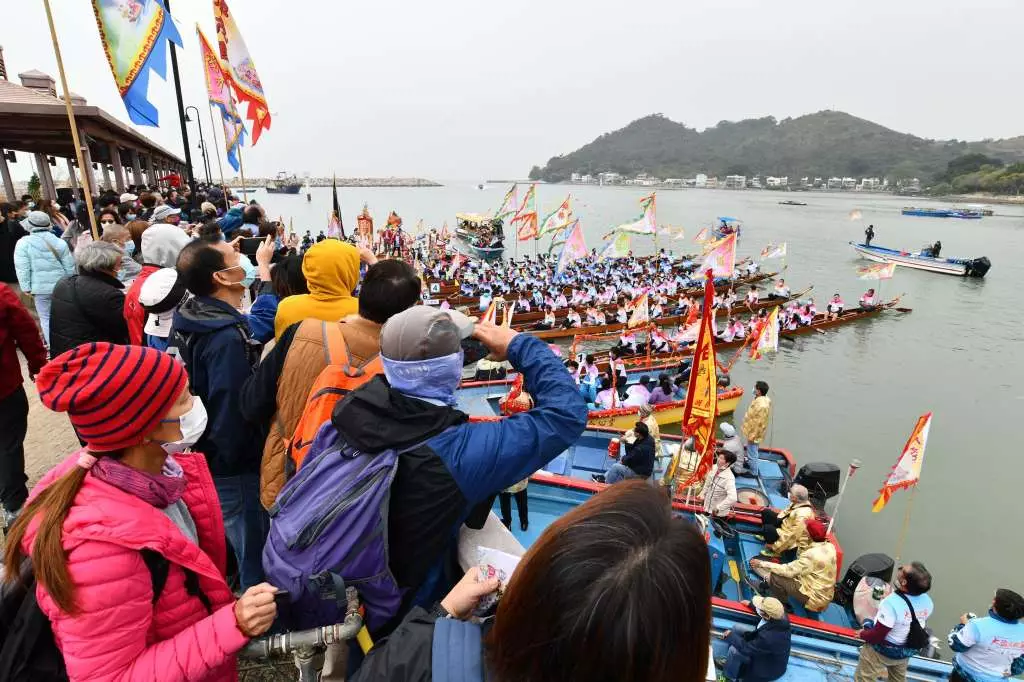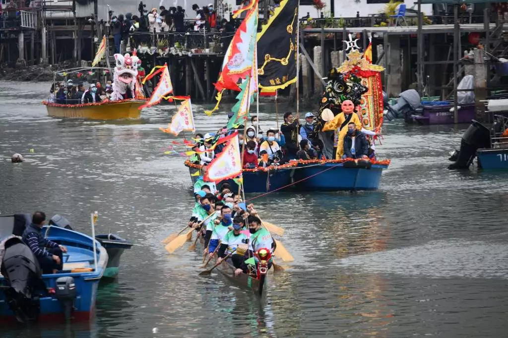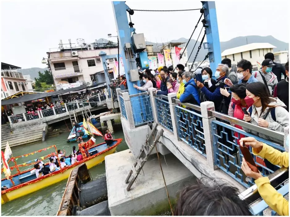 大澳在聖誕節期間舉行「大澳Let s Go!大澳文化節2021」,焦點項目「河涌巡禮Go!」水上巡遊今日舉行,吸引不少市民專程到場欣賞,擠滿橫水渡大橋。