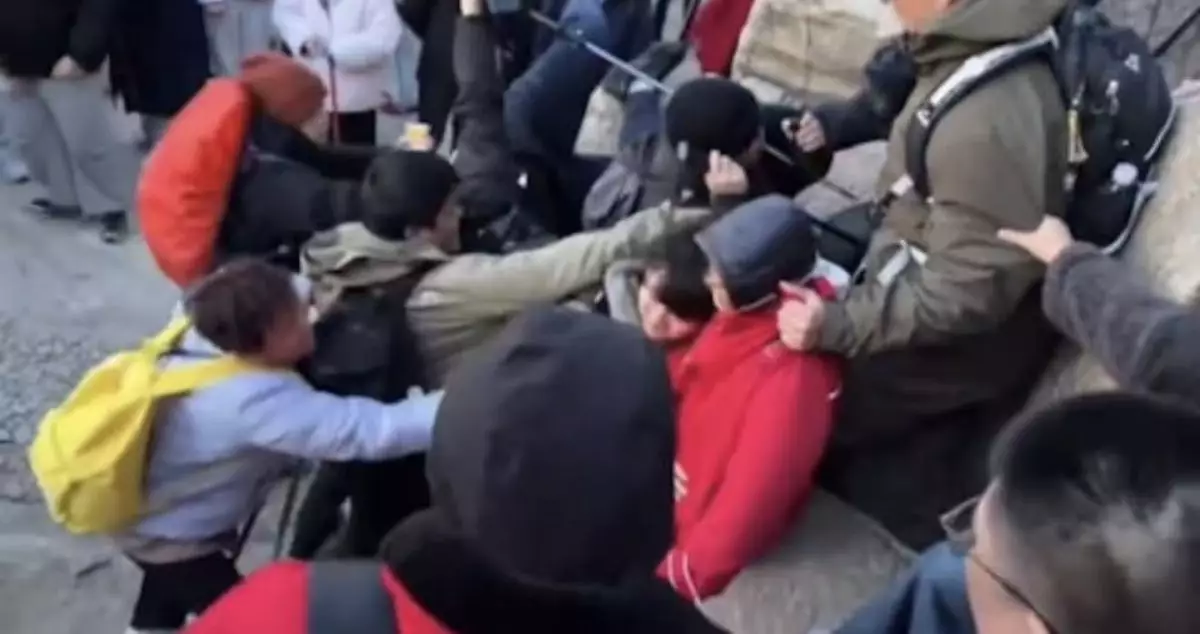 網傳片段可見,現場有多名遊客扭打成一團,其中一名背著黑色雙肩包的男子嘗試攀上較高位置時,疑遭他人從後面踢了一腳,導致重心失衡,連帶周邊人員一同從岩石滑落,場面相當驚險。另有目擊者指,混亂期間更疑出現多人圍毆一名倒地男子的情況,現場一度「人仰馬翻」。