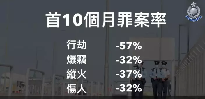 幸好,過去一年社會恢復穩定,防暴小隊的同事能夠調回前線,重新投入滅罪工作。警隊上下盡忠職守,撲滅罪行,令行劫、爆竊、縱火、傷人等暴力罪案,顯著下跌三成至六成不等。其中行劫及爆竊罪行的破案率,亦都分別達到近百分之七十及三十,創下十年新高。