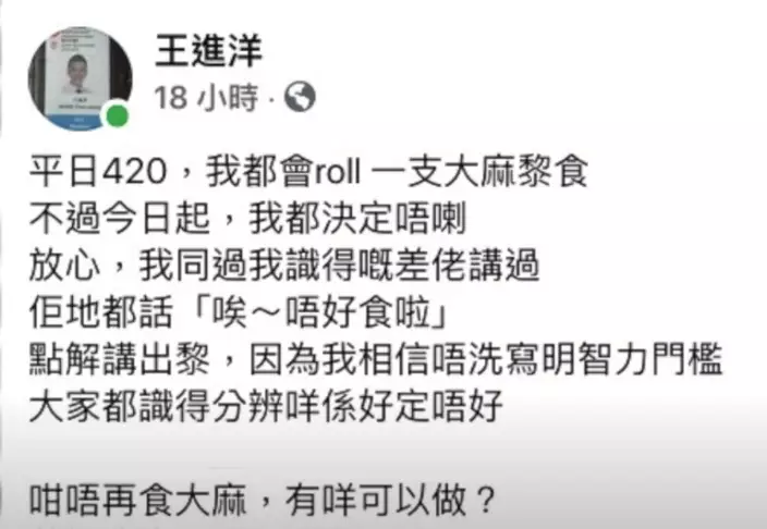 前區議員在社交平台公開宣稱自己吸食大麻,美化毒品。