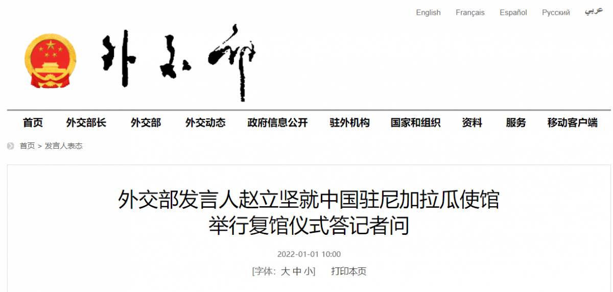 問:當地時間2021年12月31日,中國駐尼加拉瓜使館舉行了復館儀式。發言人能否介紹有關情況?
