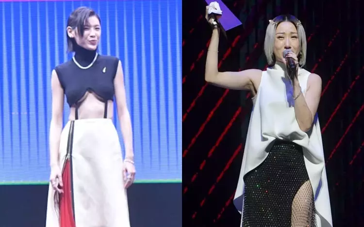 元旦日(1月1日)在亞博館Arena舉行《2021年度叱咤樂壇流行榜頒獎典禮》,一眾歌手盛裝出席,當中以陳蕾的黑白裝最性感,樽領背心的下半截「漏奶」大騷「南半球」及露纖腰,原來是有料之人,噴血指數爆燈!陳蕾與鄭欣宜、胡鴻鈞及岑寧儀一同出場,期間不慎被長裙伴倒,幸沒有整個人仆落地。另外,謝安琪則穿上白色tube top,並用高腰褲托胸,騷香肩兼微露事業線。