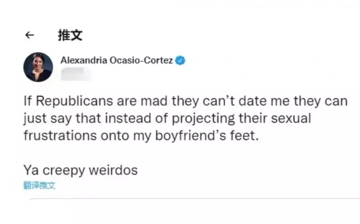 AOC在推特上如此回應共和黨人針對她的批評——「如果共和黨人震怒了,是因為他們不能和我約會,他們可以直接說出來,而非將不能和我上床的怨氣,投射到我男朋友的腳上(指他皮膚蒼白)——這真是些令人毛骨悚然的怪人」。