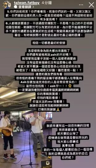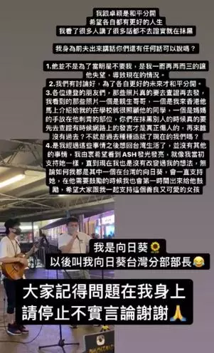不過,隨着離婚消息曝光,Ash亦被人爆出不少負面新聞,有網友更指控是她出軌才導致離婚,前夫有見及此,今日在IG限時動態出Post為Ash護航:「我跟卓穎是和平分開,希望各自都有更好的人生,我看了很多人講了很多話都不去證實就在抹黑。」前夫又指離婚原因是他的問題:「他(她)並不是為了當明星不要我,是我一而再再而三的讓他(她)失望,導致現在的情況。」前夫不單把離婚責任孭上身,更自嘲又肥又醜又窮:「你們會跟這樣的男人一起甚至結婚嗎?」最後前夫不忘叮囑網友不要再攻擊Ash,更形容她是一個善良的女仔。