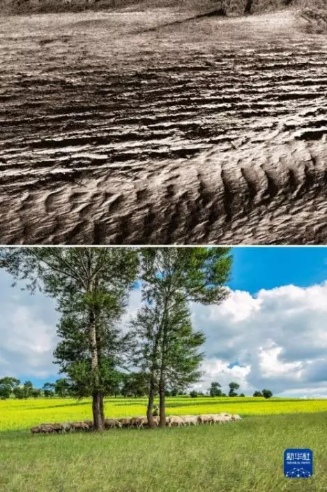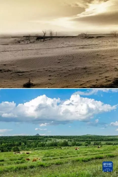 這是一張拼版照片。上圖為:治理前,山西省右玉縣的荒涼沙地(資料照片);下圖為:7月22日拍攝的山西省右玉縣右衛鎮北草場村的景色(新華社發李秀山攝)。