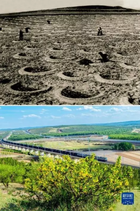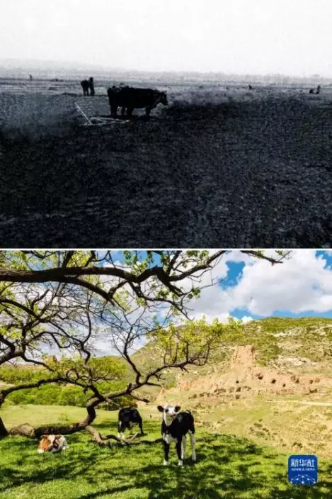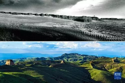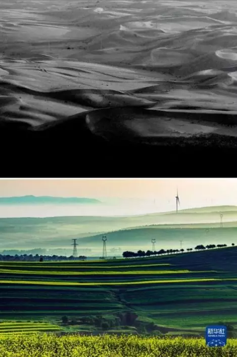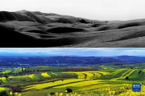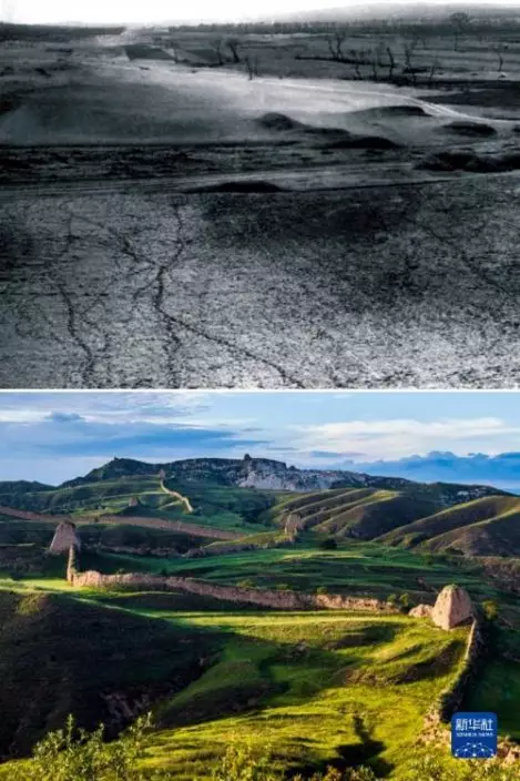 這是一張拼版照片。上圖為:治理前,山西省右玉縣的荒涼沙地(資料照片);下圖為:5月26日拍攝的山西省右玉縣右衛鎮的景色(新華社發李秀山攝)。