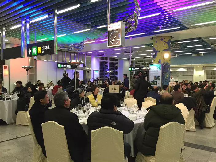 開派對的海洋公園站幾有海洋feel,八面玲瓏的Fit馬搞派對當然有氣氛,走勻全場,又識得跟貼時事講吓笑,話在港鐵站內筵開十席係「史無前例」,叫記者「打卡」影相,同人講時記住強調「我真係、真係嚟過架!」