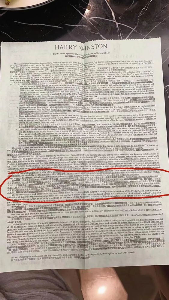 客戶特此認可並接受:在此過程中商品上寶石的重量及質量均可能會有所改變,客戶同意並理解,海瑞溫斯頓無需對此承擔任何責任,並放棄、豁免且不再對海瑞溫斯頓主張與卸載或重裝寶石過程有關的任何索賠。