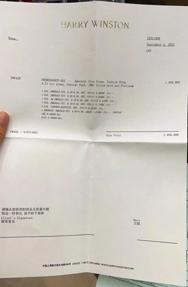 據王先生說,他和太太去年6月5日在黃浦區太倉路188號「海瑞溫斯頓新天地品牌旗艦館」看中了一枚“中央公園”祖母綠寶石戒指,4.21克拉,價格145萬元整。