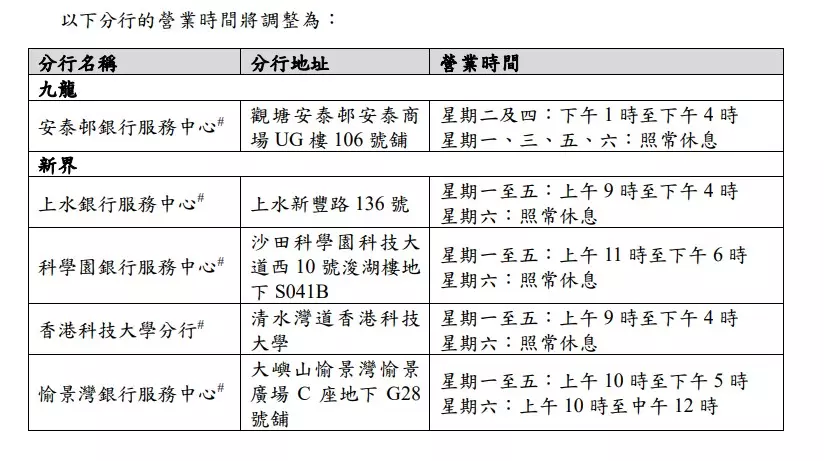 除5間分行的特別安排外,其餘分行於星期一至星期五的營業時間將調整為上午9時至下午4時,星期六的營業時間將調整為上午9時至中午12 時。存支票機於星期一至五的截數時間將調整為下午4時,如支票於截數後存入,將於下一個結算日處理。客戶亦可透過該行24小時自助銀行中心、自動櫃員機、手機、網上及電話銀行等電子渠道使用服務。此外,早前暫停營業的灣仔胡忠大廈分行將於明日起恢復服務。