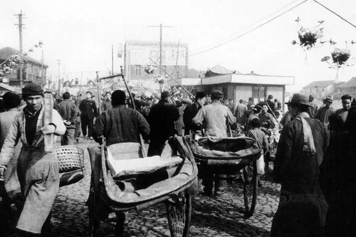 上世紀20年代,人們在北京街頭買年貨,迎新年。(網上圖片)
